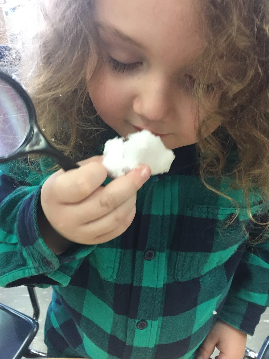 The last two questions, “How is snow made?” and “How does snow fall?” led us to explore the scientific process of snow. I have found with questions such as these, which can be a bit difficult for little minds to grasp, making it as concrete as possible really helps them get it.