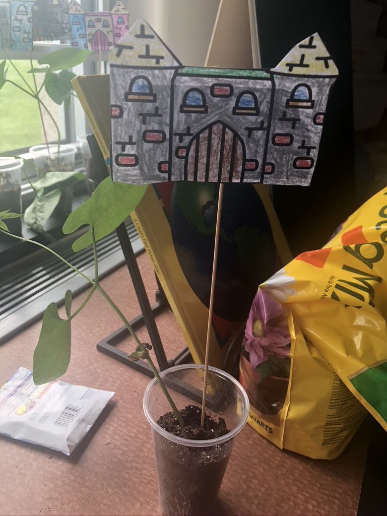 Before doing so, we colored and cut out a storybook castle and put it on a stick for our beanstalk to wrap around. We used the one found in the Jack and the Beanstalk Story Map, but kids can also get creative and draw their own castles. Much thanks to Wonders Of Kindergarten for sharing this really fun idea.